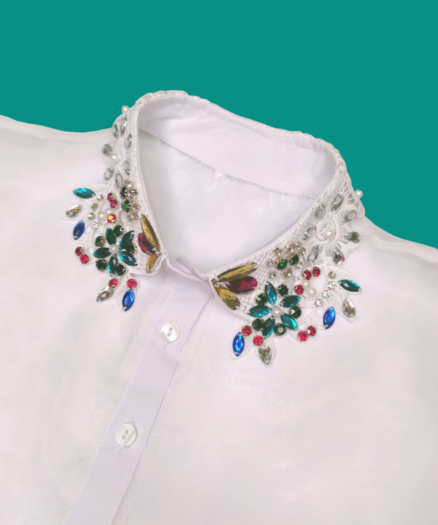 یقه فیک یا یقه حجاب مشکی و سفید سنگ دوزی شده تولیدی الهام با پارچه حریر ارگانزا درجه یک کار شده و سنگ های دوخته شده روی یقه دوختی هستند و برای مصرف مجلسی بسیار راحت و کاربردی است، فری سایز است از 38 تا سایز 48 قابل استفاده است. کنار یقه حجاب کش جهت فیکس ماندن کار شده است. برای خانمهایی که تا به امروز به خاطر بازی یقه یک لباس از پوشیدن آن محروم بودند این یقه فیک با پوشش کامل گردن و سینه این امکان را به شما می دهد.که علاوه بر تکمیل کردن پوشش خود در مجالس بدرخشید. هم تکی و هم عمده قابل سفارش است.