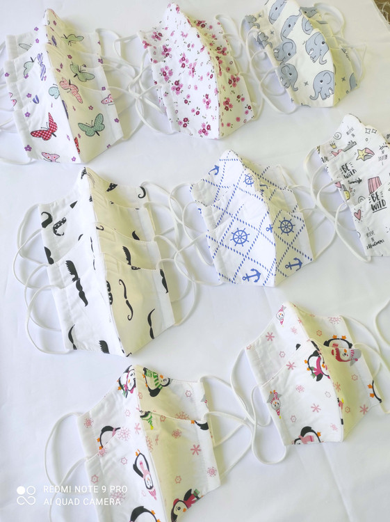 ماسک کودک کتان پنبه با پارچه داخلی صد درصد اصل کتان اجرا شده و بالای ماسک یک فنر توکار جهت فیکس شدن روی بینی کار شده.