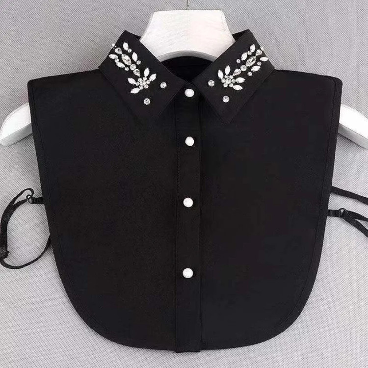 یقه فیک یا یقه حجاب مشکی و سفید سنگ دوزی شده تولیدی الهام با پارچه تترون درجه یک کار شده و برای مصرف روزانه بسیار راحت و مناسب است.، فری سایز است. از 38 تا سایز 48 قابل استفاده است. کنار یقه حجاب کش جهت فیکس ماندن کار شده است. برای خانمهایی که تا به امروز به خاطر بازی یقه یک لباس از پوشیدن آن محروم بودند این یقه فیک با پوشش کامل گردن و سینه این امکان را به شما می دهد.که علاوه بر تکمیل کردن پوشش خود در مجالس بدرخشید. هم تکی و هم عمده قابل سفارش است.